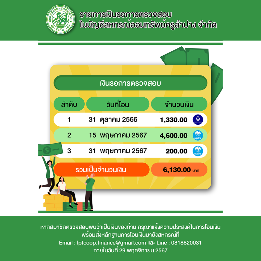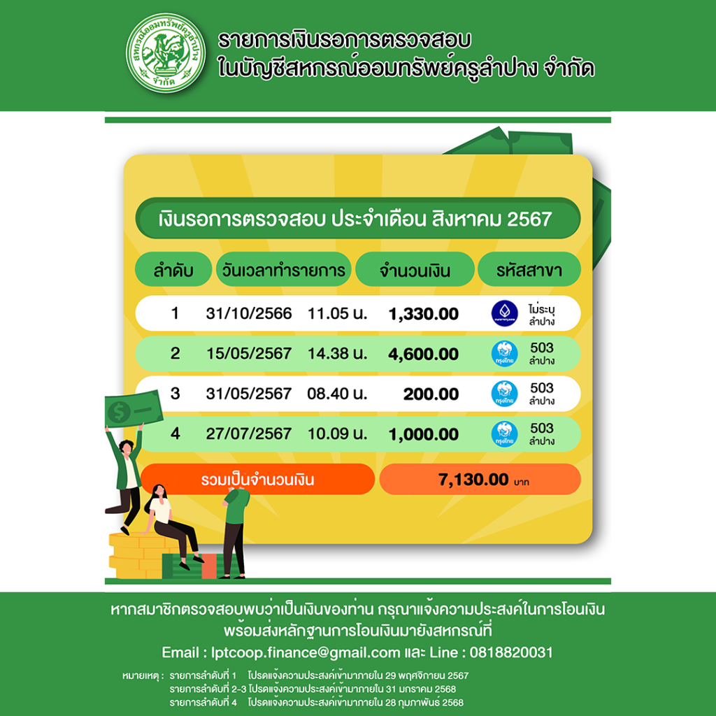 รายการเงินรอตรวจสอบในบัญชีสหกรณ์ออมทรัพย์ครูลำปาง จำกัด ประจำเดือนสิงหาคม 2567